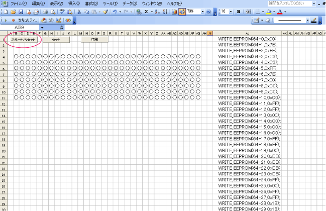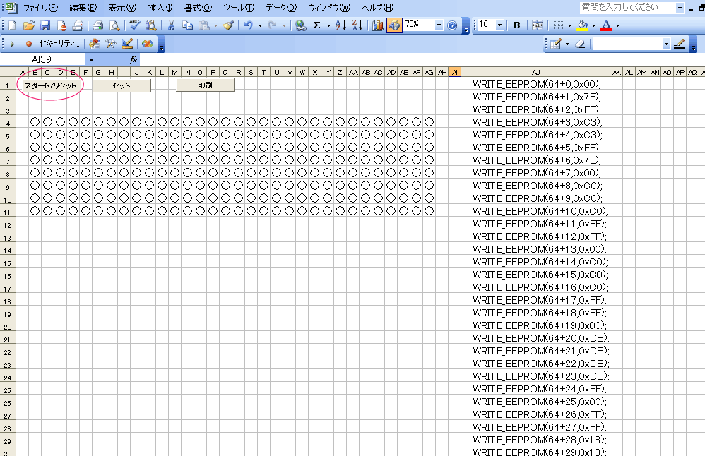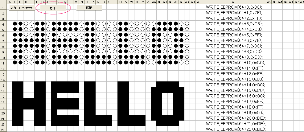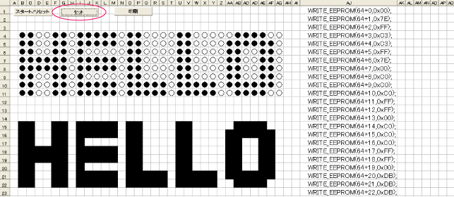 すると、下に模様が表示され、さらに、右側にプログラムソース(WRITE_EEPROM(64+*,0x**))が書き出されます。
