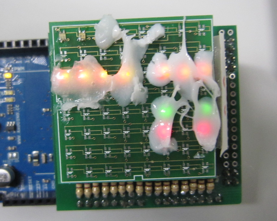ADCの値を見てみると、緑LEDに260Ωをつけた状態で60くらい出るのであとは微調整か。写真に撮ってみたけど撮れた画像がどうも混ざって見えるので効果がよくわからないことに。あとでまたアップしておこう