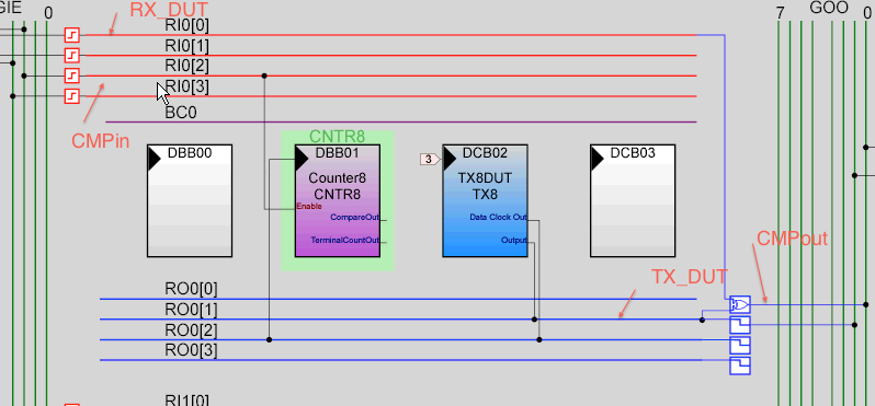どうも動作がおかしいような気がしていたんだけど、やっと理解ができた。 TX8のTX8_COMPLETEフラグは、送信中のデータのStopビット送信後に立つが、この送信中データは、TX8_BUFFER_REGではなく、TX8_Shift_REGなので、連続して送信するときは、タイミングがけっこう理解しにくい。