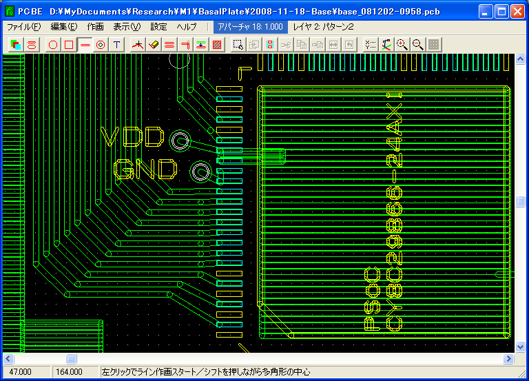 PSoC周辺の配線を描いている最中なのですが、CY8C29866-24AXIはTQFPパッケージで、しかも配線間隔が0.5mmという設定なので、いちいちグリッドを2.54mmと切り替えなくてはいけないので、面倒くさいですorz