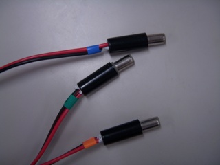 オシロのプローブで基板上のICの信号などを見ているとき、プローブだとつまみにくいところをつまみやすいようにクリップ(Sunhayatoの、本当は0.5mmピッチQFPの足もつまめるシロモノらしい)。やはり同じように色分け。あと反対側は、プローブでつまむように皮をむいただけだけど、もちろん半田メッキ。