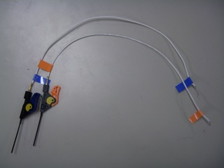 オシロのプローブで基板上のICの信号などを見ているとき、プローブだとつまみにくいところをつまみやすいようにクリップ(Sunhayatoの、本当は0.5mmピッチQFPの足もつまめるシロモノらしい)。やはり同じように色分け。あと反対側は、プローブでつまむように皮をむいただけだけど、もちろん半田メッキ。